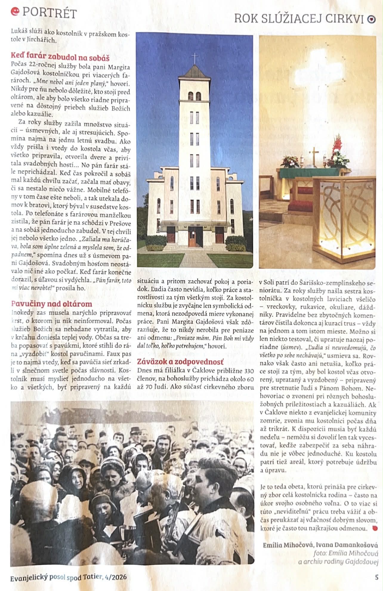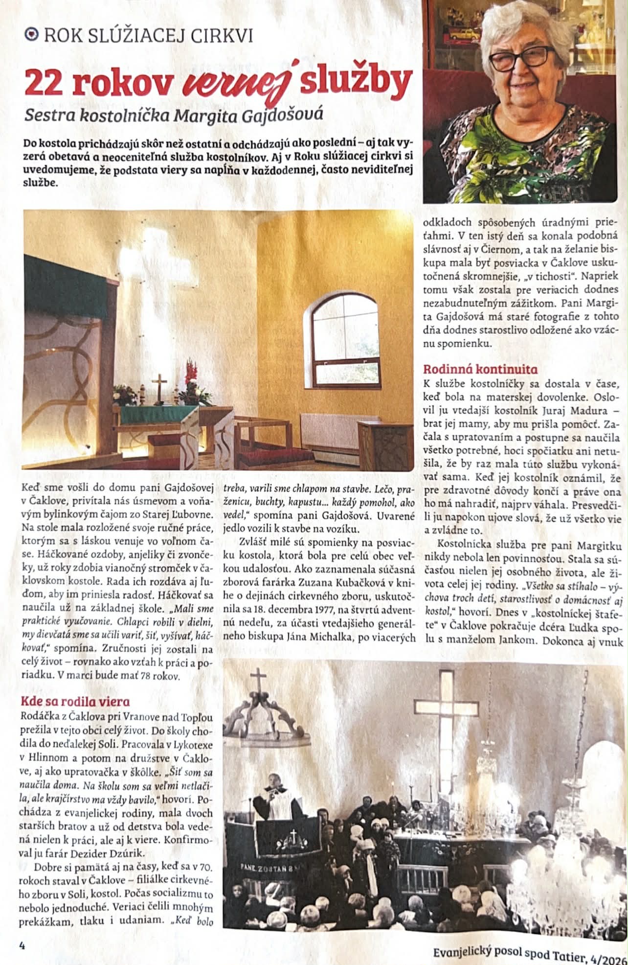 V EVANJELICKOM POSLI SPOD TATIER JE ČLÁNOK O S. MARGITE GAJDOŠOVEJ - KOSTOLNÍČKE, KTORÁ SLÚŽILA V NAŠEJ FILIÁLKE ČAKLOV 22 ROKOV.
