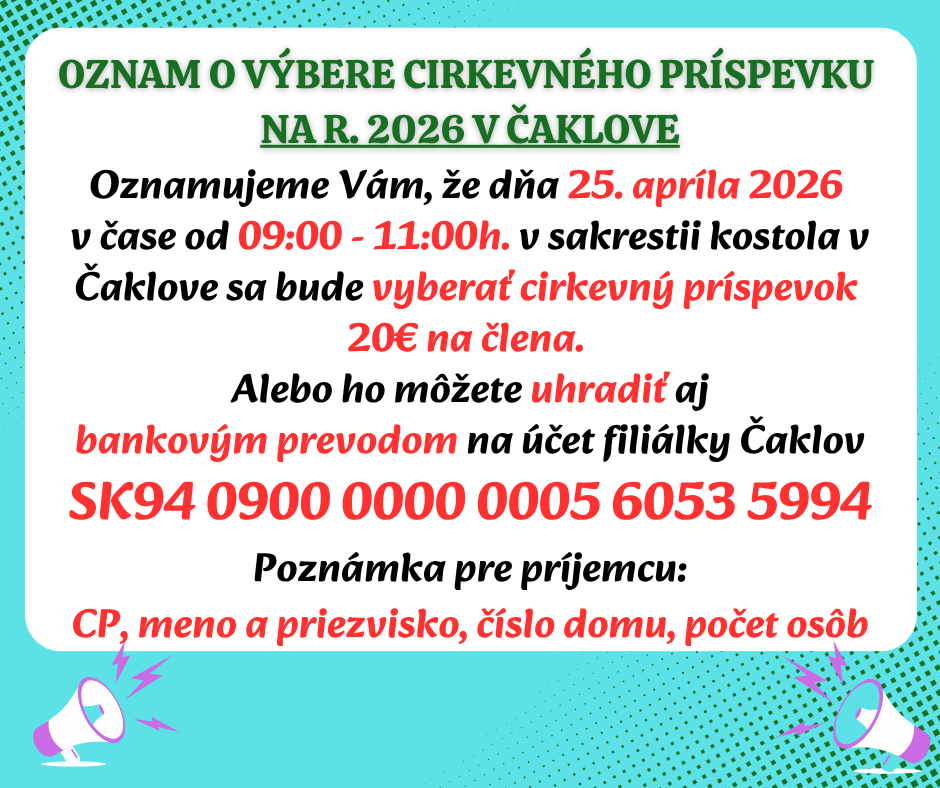 OZNAM O VÝBERE CIRKEVNÉHO PRÍSPEVKU V ČAKLOVE