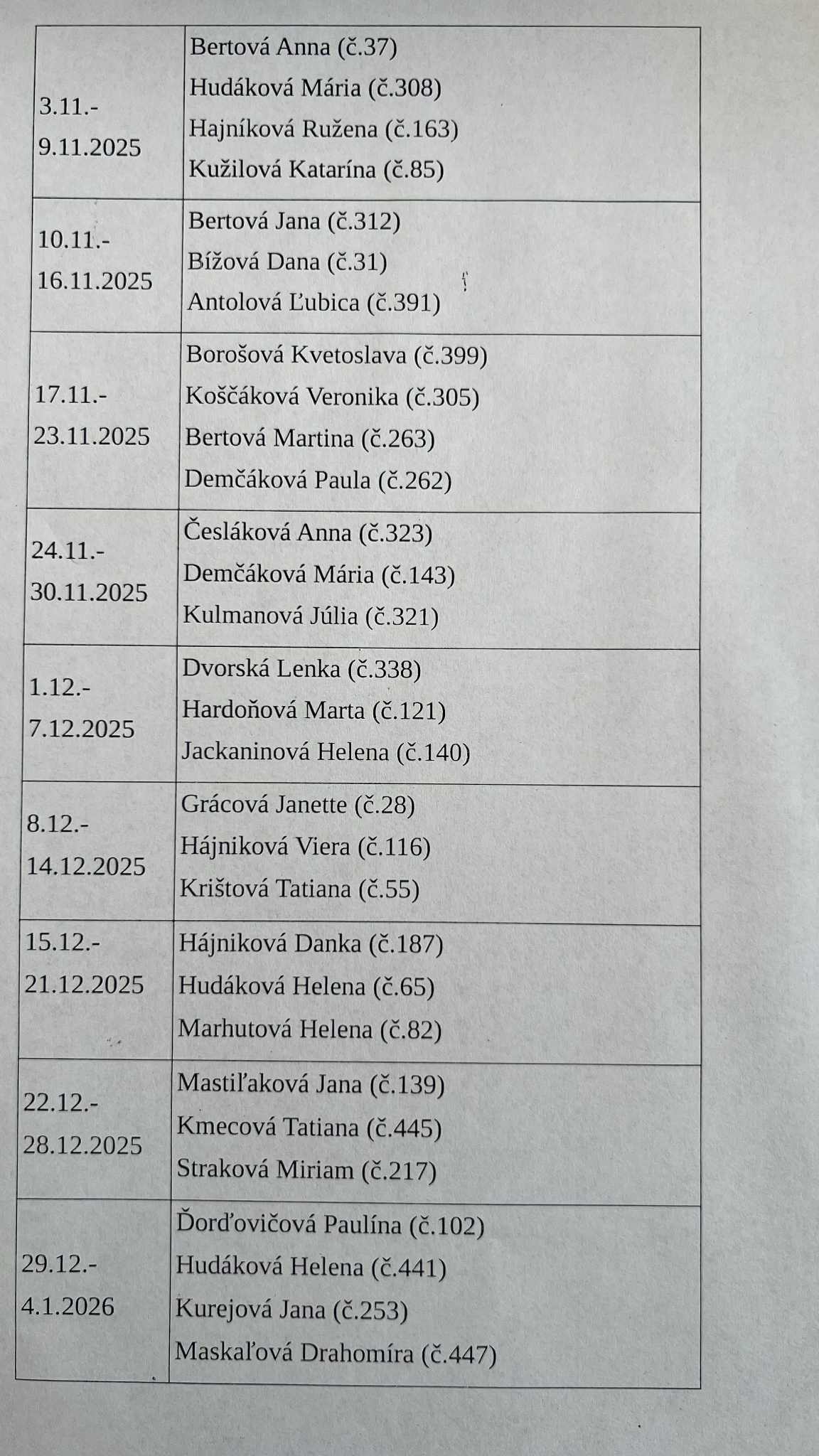 Pripravili sme zoznam s trojicami – štvoricami mien sestier. Pri každej je uvedený týždeň, kedy treba kostol upratať. Presný deň a čas nechávame na Vás, aby ste sa vzájomne dohodli, kedy Vám to bude najviac vyhovovať. Tiež je možné, ak niekomu daný termín / týždeň nevyhovuje, sa s niekým iným vymeniť, alebo za seba nájsť náhradu. Ak máte niekoho vo svojej domácnosti, kto by vedel pomôcť viac ako Vy, môžete ho poslať namiesto seba.